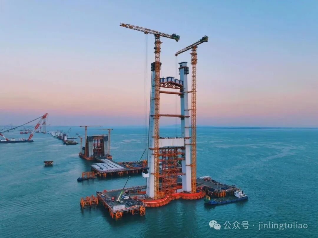 厦金大桥(厦门段)全长约19.62公里,其中刘五店航道桥作为核心控制性工程,主跨达928米,索塔高178.1米,是福建省内最大跨径的离岸式海中悬索桥。此次封顶的东、西主塔,其防撞钢套箱更是创下国内纪录——呈哑铃状的双壁钢套箱总长105.8米、总宽47米,总平面面积达3842平方米,相当于9个标准篮球场大小,总重量超4200吨,规模远超港珠澳大桥同类构件。
