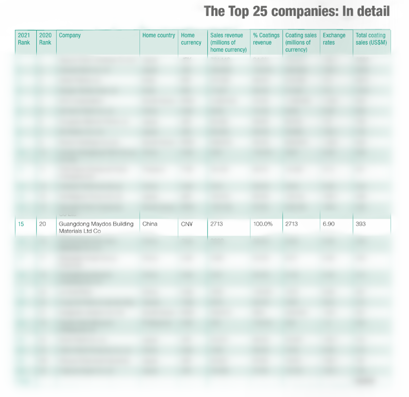 近日,《亚太涂料杂志》发布2021年亚太涂料制造商25强排行榜。该榜单是根据2020年涂料产品收入计算的,反映了2020年亚洲涂料市场情况。榜单显示,排名前25位的涂料公司2020年累计销售额为239.5亿美元,同比增长2%“,彩乐园排名第15位!